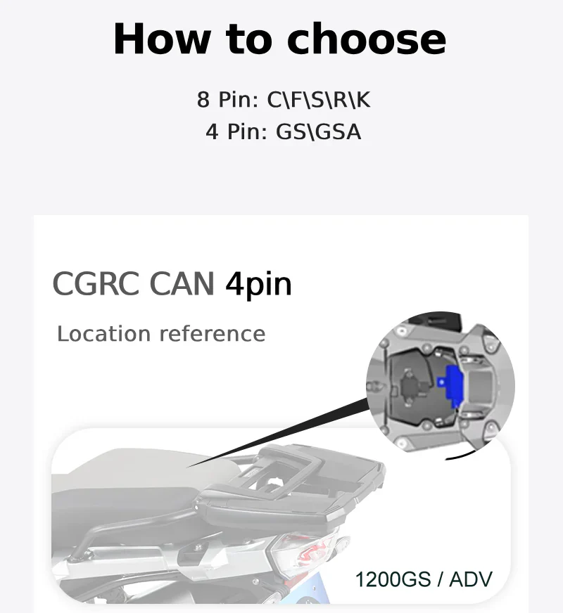During setup, all you need to do is plug the CGRC CAN into one of two module interfaces: either the 4-pin port for the RDC module, which handles tire pressure monitoring, or the 8-pin port for the DWA module, which is the bike’s anti-theft alarm system. While our online guides recommend certain purchases, they are suggestions for reference only. If upon inspecting your BMW, you find that a DWA or RDC module would allow for easier installation, feel free to purchase the appropriate pin connectors based on your specific bike’s fitment.