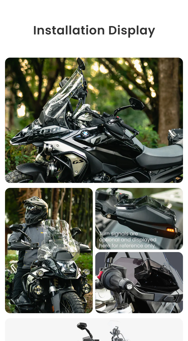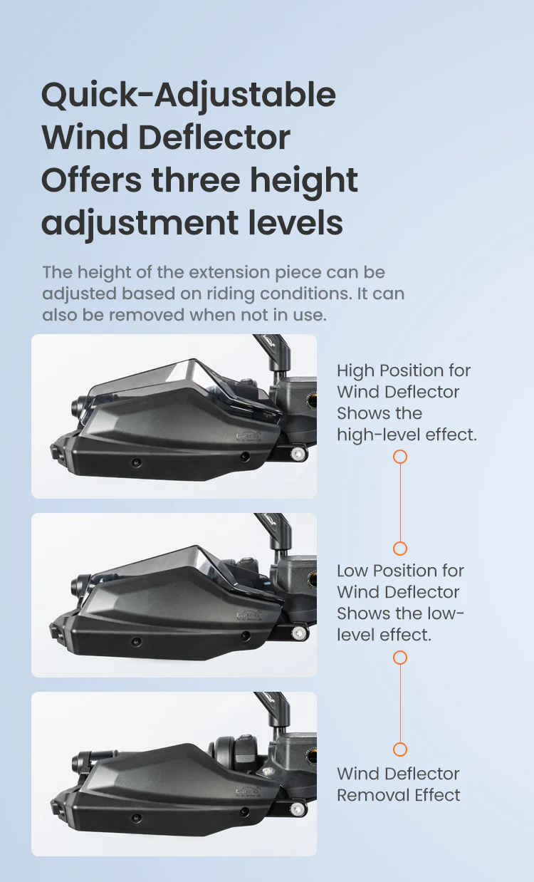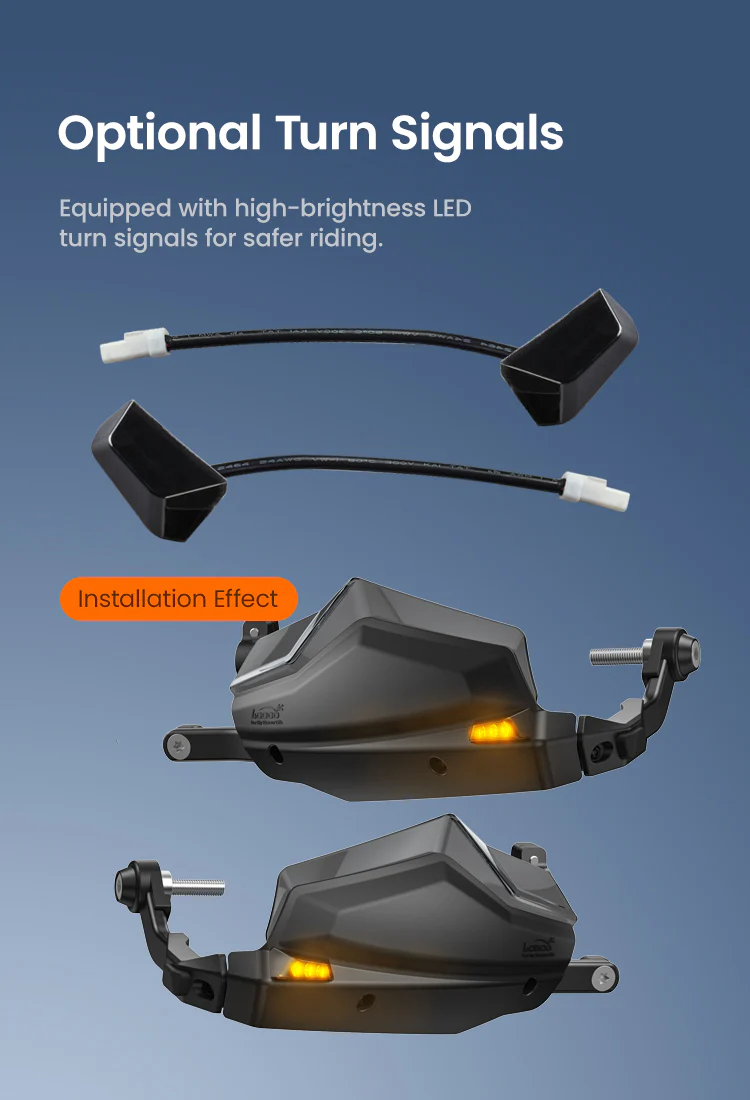 Equipped with a three-level adjustable wind deflector, this design adapts seamlessly to your riding needs. Whether you’re braving winter winds or staying cool in summer, your hands stay shielded in optimal comfort. - Optional LED Turn Signals for Enhanced Night Visibility