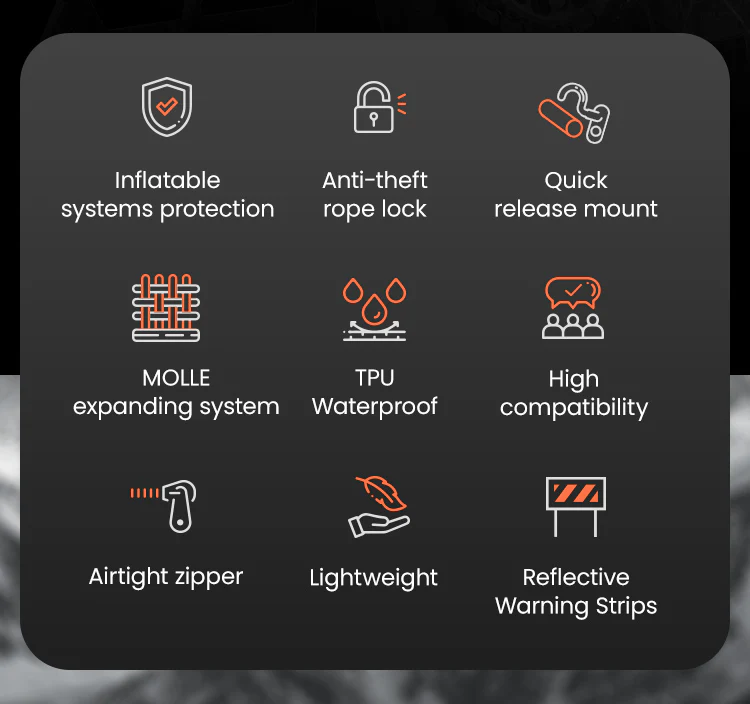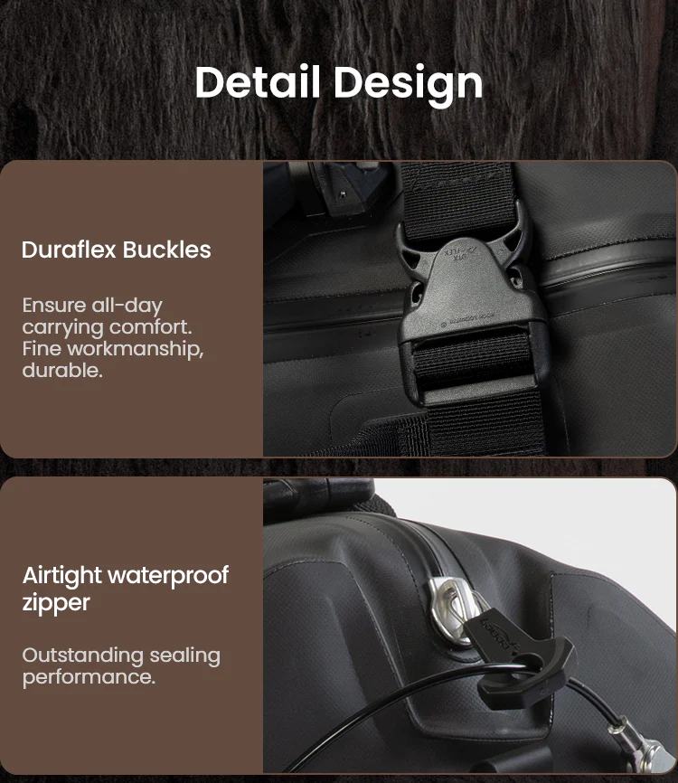 • Waterproof & Anti-Theft Features: Made from TPU composite waterproof fabric with IPX7 certification and waterproof zippers, ensuring gear remains dry even in heavy rain. An integrated anti-theft system adds a layer of security for peace of mind.