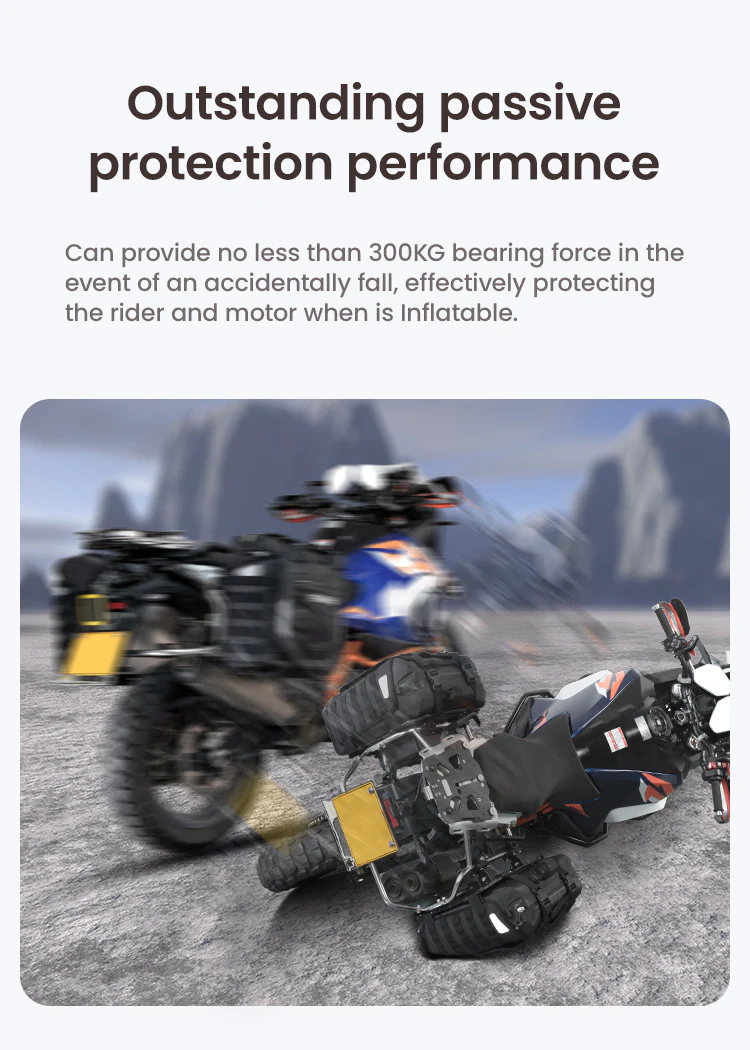 • Inflation Protection System: Provides exceptional passive protection, with a load-bearing capacity of over 300KG during vehicle falls or accidents, effectively safeguarding the rider, passenger, and vehicle for enhanced riding safety.