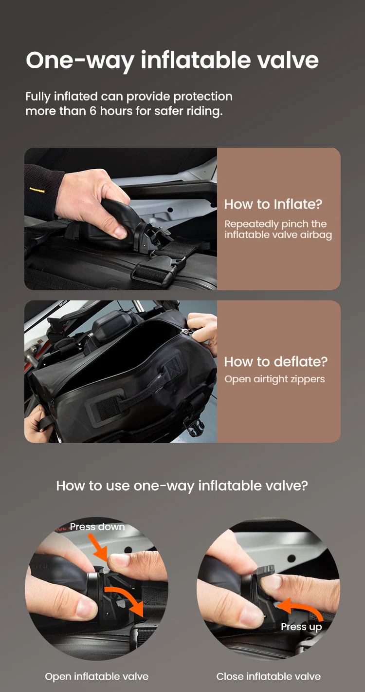 • Unidirectional Inflation Technology: Features a one-way inflation valve that maintains protective inflation for no less than 6 hours after each use, ensuring continuous safety during rides.