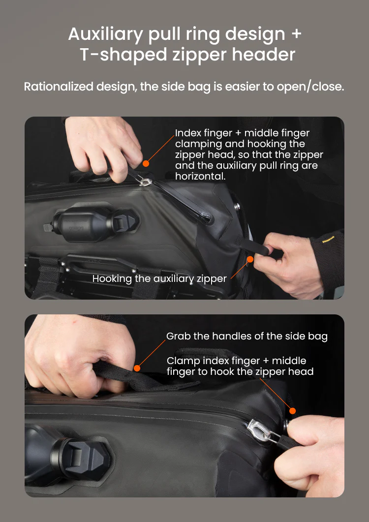 • Quick Access Design: Equipped with an auxiliary pull tab and T-shaped zipper head, allowing users to open and close the side bag effortlessly while ensuring quick access to items.