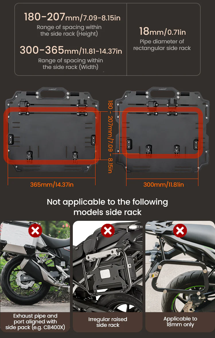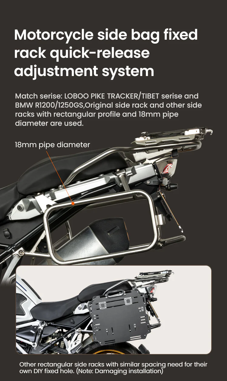 • Adjustable Quick-Release Mounting Structure: Designed for compatibility with LOBOO TIBET and PIKE TRACKER series racks, as well as original BMW side racks.