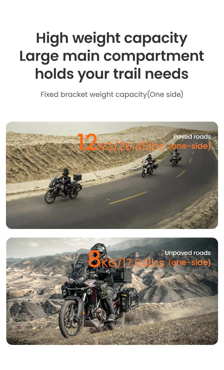 • Single Bag Load Capacity: Designed to carry up to 12KG on roads and 8KG off-road, ensuring reliability across various terrains.