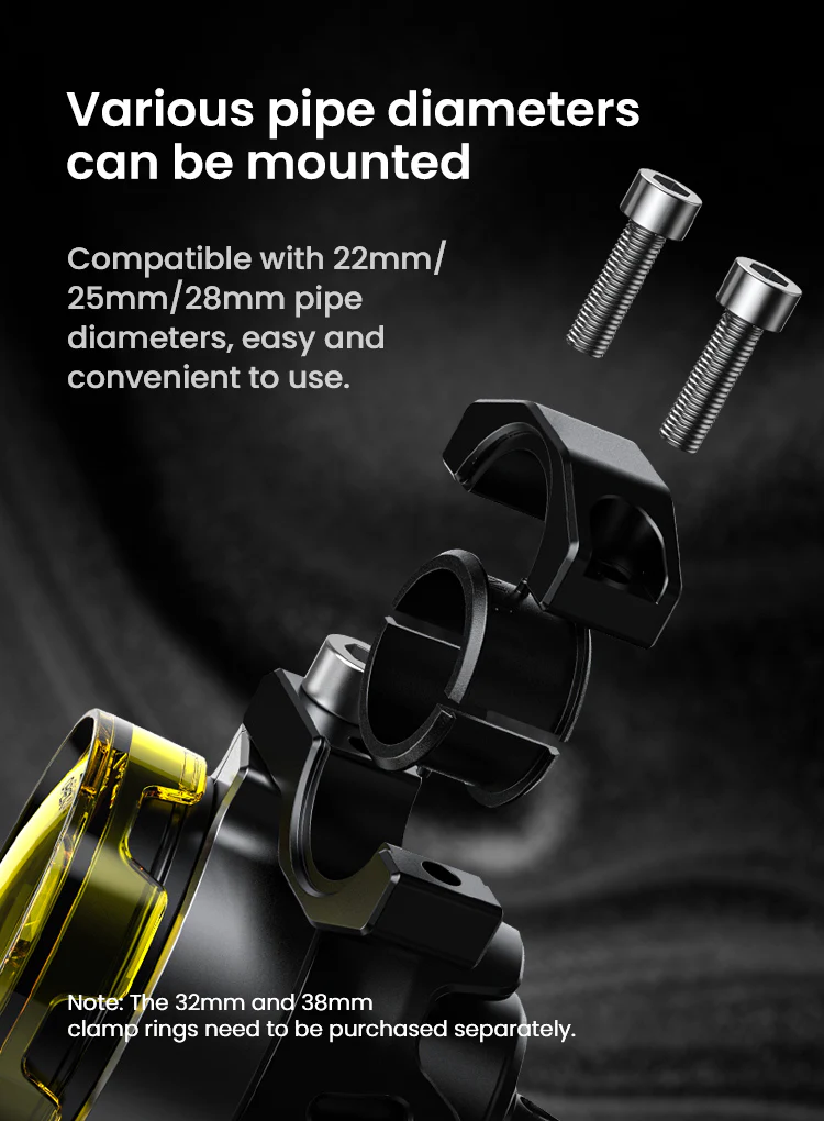 - Multiple mounting options: Motorcycle LED driving fog lights is make of aluminium alloy base and the stainless steel body fixing bracket form a universal bracket that can be adjusted at any angle. The 5 sizes of sleeves (22mm, 25mnm, 28mm, 32mm, 38mm) included in the package will fit most handlebar diameters and can be mounted in the position you want, depending on the diameter of your handlebar.