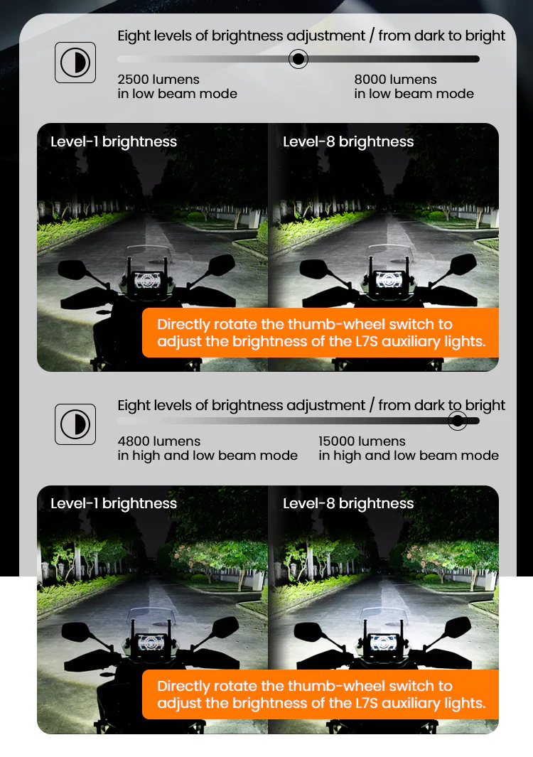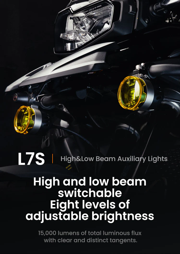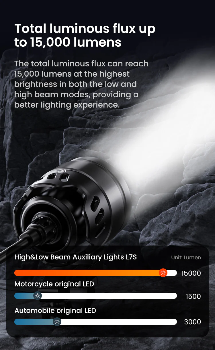 L7S Motorcycle Auxiliary Lights – 15000LM High/Low Beam Driving Fog Lamps, 3 Warning Modes, IP68 Waterproof, CNC Alloy Housing, Fits 22–28mm Bars (Pair)