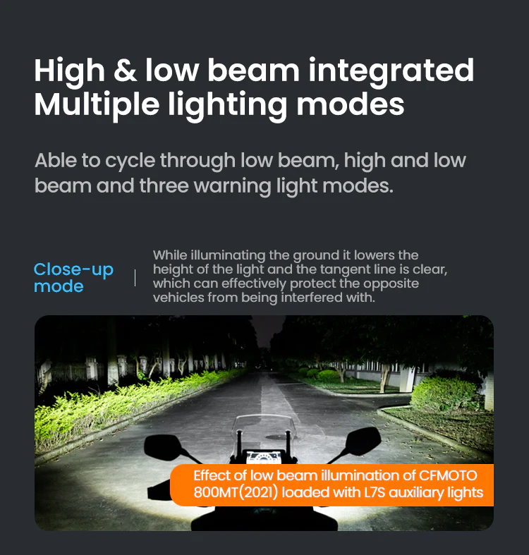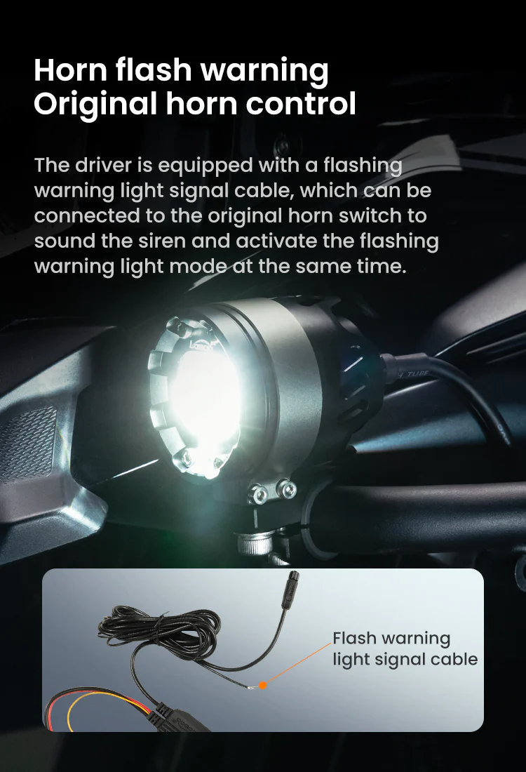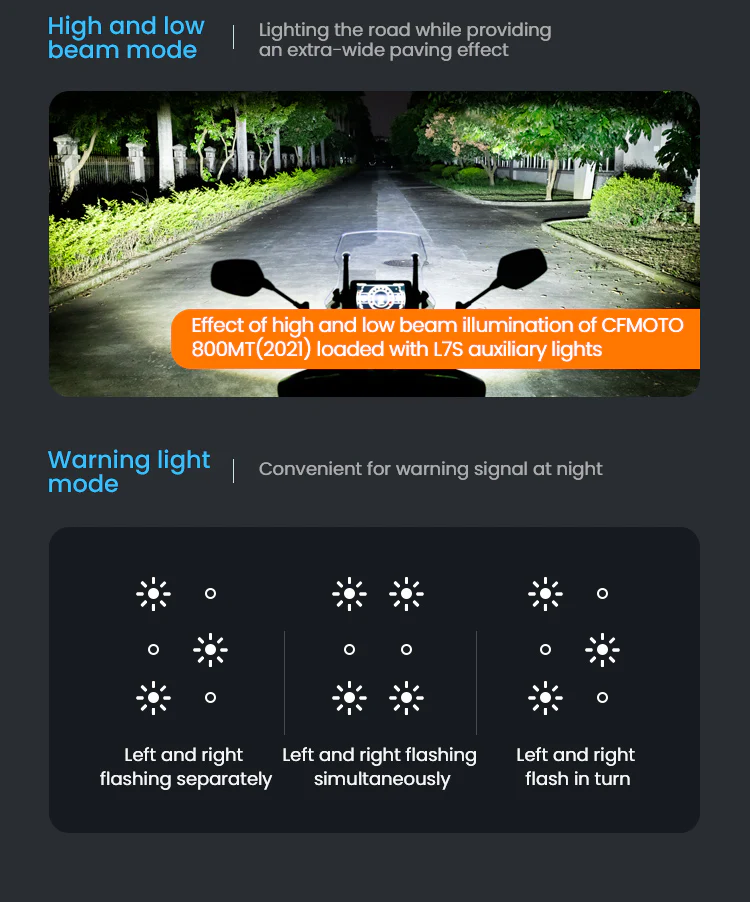 - Multiple lighting modes: Supports cycling between low beam, high and low beam, and three warning light modes, providing more options.