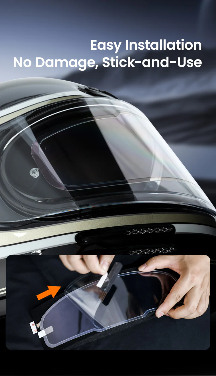 Switch between Auto Mode and Manual Mode with a simple long press. Auto adapts to ambient light; manual lets you tint on-demand with a tap. Whether you’re riding tree-lined roads or facing intense sunlight, you stay in full control without distraction. - 【Universal Helmet Compatibility – Stick & Ride】