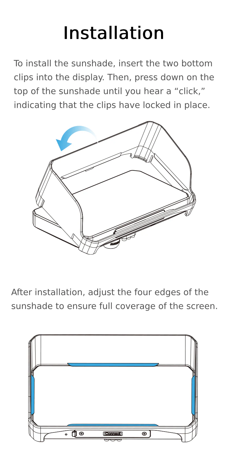 *Note: Make sure to follow the installation video when setting up the Sun Shade to prevent any damage to the display or tempered glass.