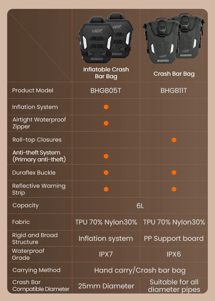 Wanderer Motorcycle Crash Bar Bags – Inflatable, Waterproof Frame Bags with Reflective Strips & Anti-Theft System (Pair)
