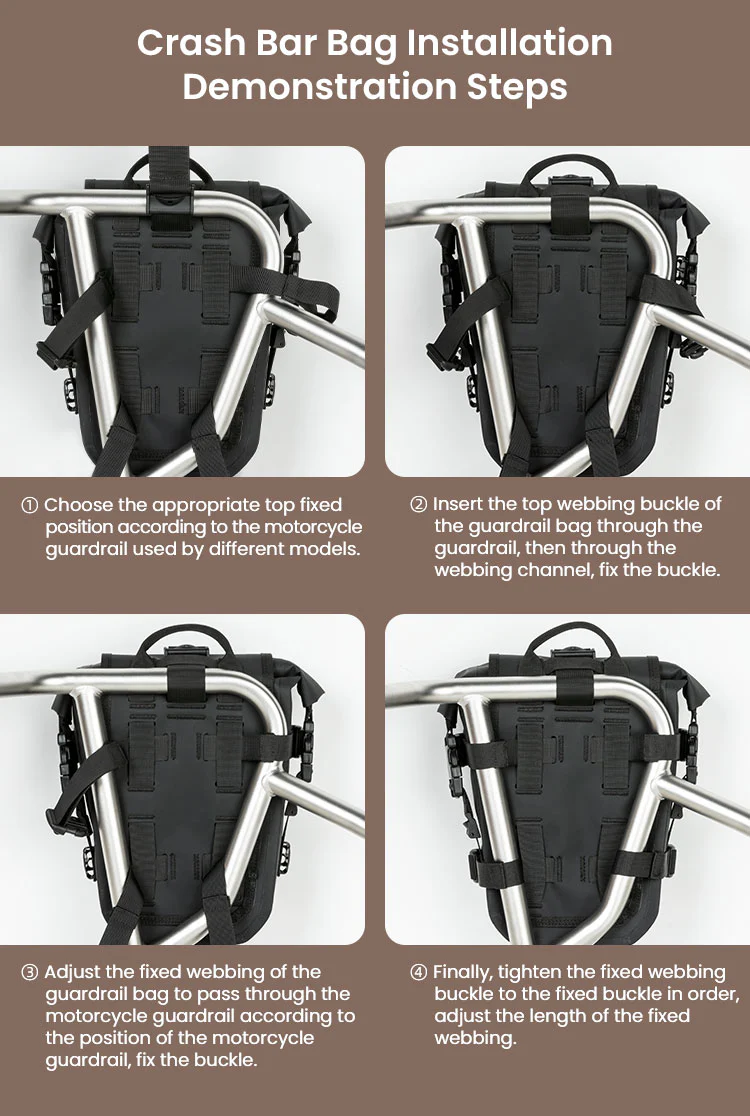 The adjustable strap fixing buckles and universal mount design accommodate 25mm crash bar diameters, ensuring compatibility with a wide range of motorcycles. The intuitive installation process, complemented by lightweight yet sturdy materials, makes these bags an indispensable addition for riders seeking convenience and style. Strap one or more of the motorcycle frame bag directly to your bike and use it as a front bag, dirt bike bag, tail bag, crash bar bag or sissy bar bag for your daily adventures. - Reinforced Inflatable Protection
